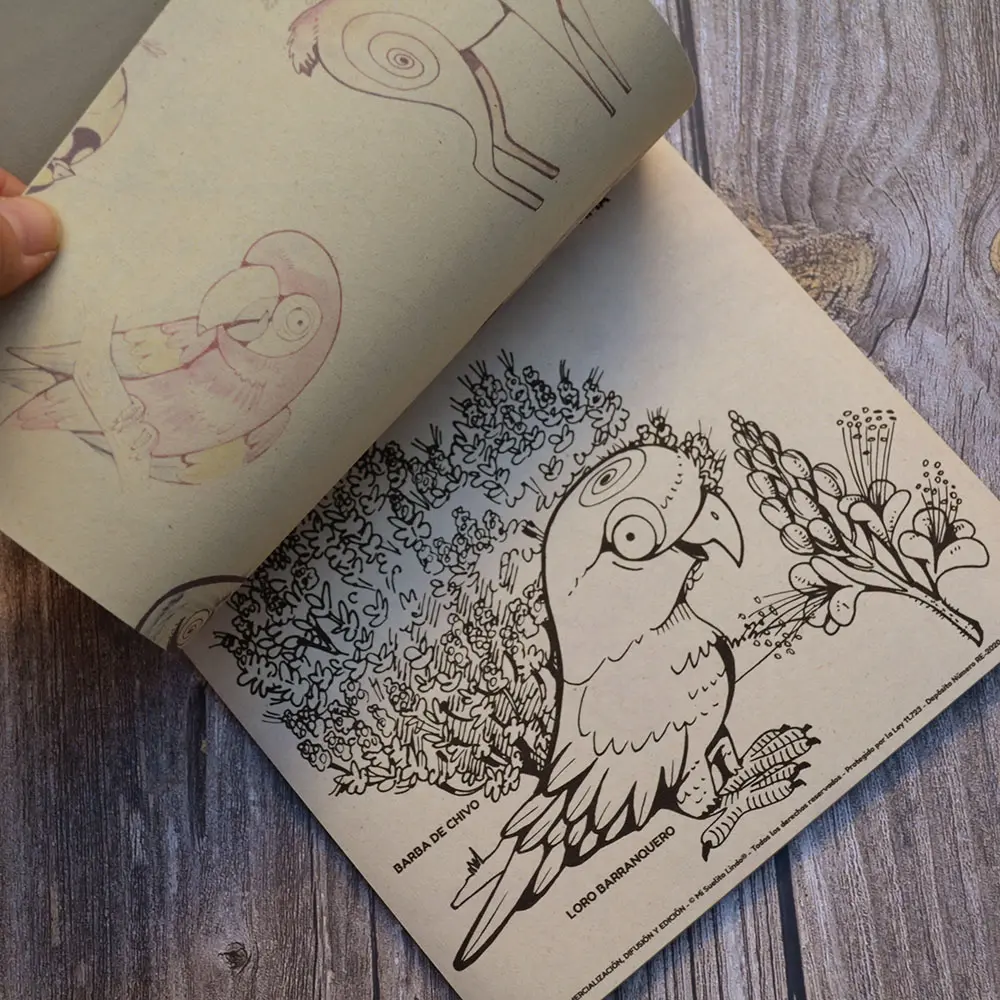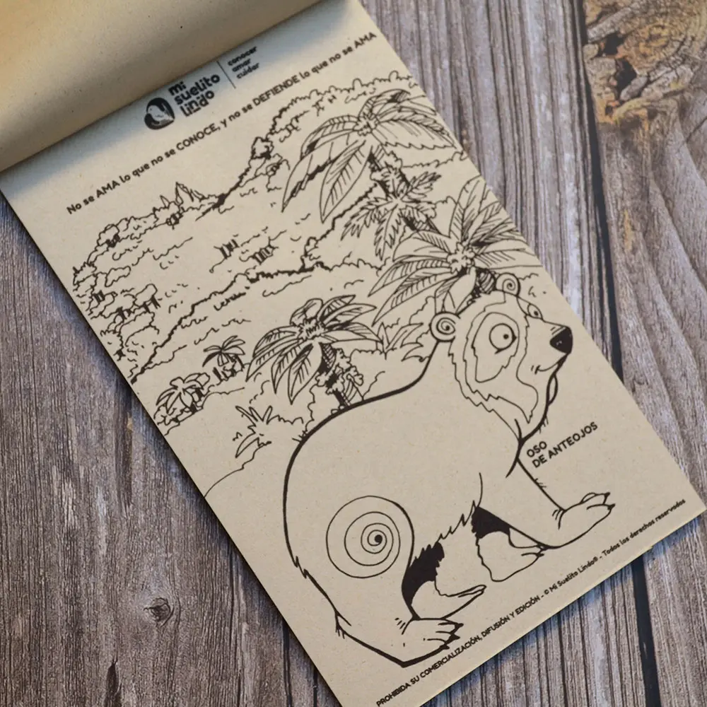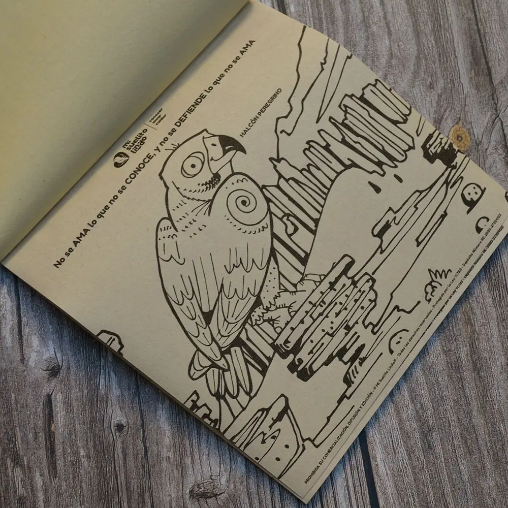 Cada hoja tiene una ilustración de una especie de fauna autóctona, en su entorno natural. Cada uno puede colorear como desee. Cada hoja, si se desea, se puede arrancar (para regalar por ejemplo).